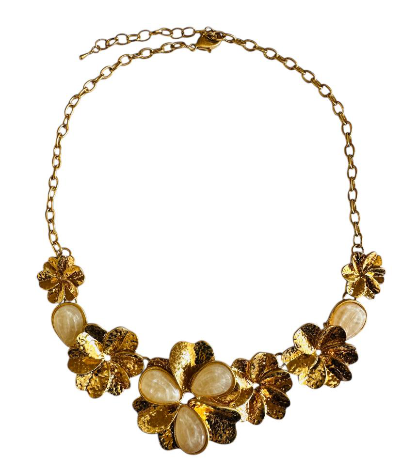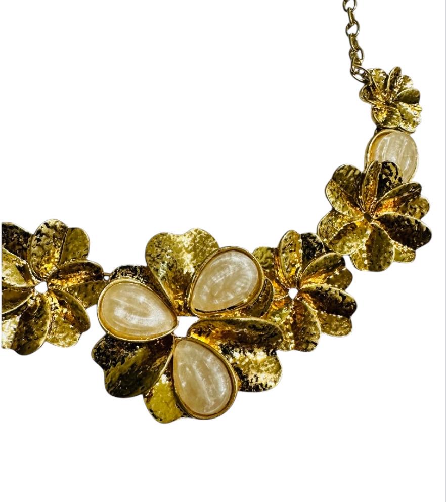 Collana statement in metallo dorato con elementi floreali martellati e inserti in resina effetto madreperla beige. Il design a cinque petali e i dettagli lucenti creano un effetto elegante e scenografico. Perfetta da indossare con abiti monocromatici per esaltare ogni look con un tocco di luce e raffinatezza.